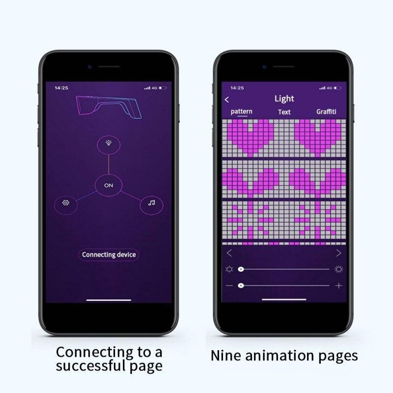 Através do APLICATIVO GRATUITO (GlowGlasses - verde) disponível na Apple Store ou na Google Play, você pode escrever sua mensagem, desenhar sua figura e fazer animações! Além de poder sincronizar com a música que você está ouvindo e exibir no equalizador.