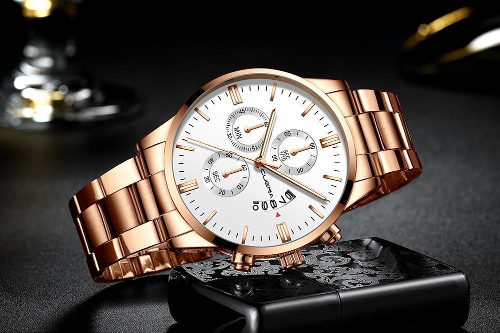 e uma pulseira resistente, 100% revestida em aço inoxidável.